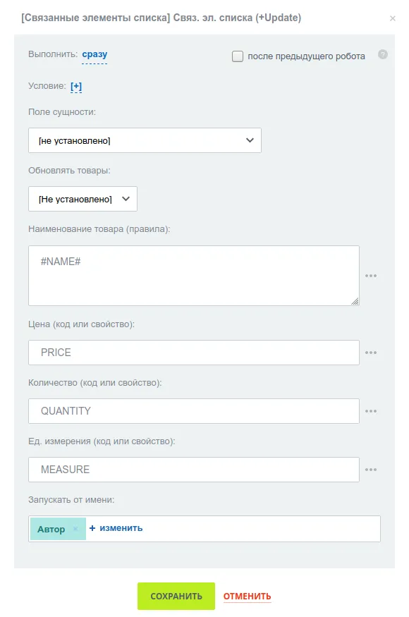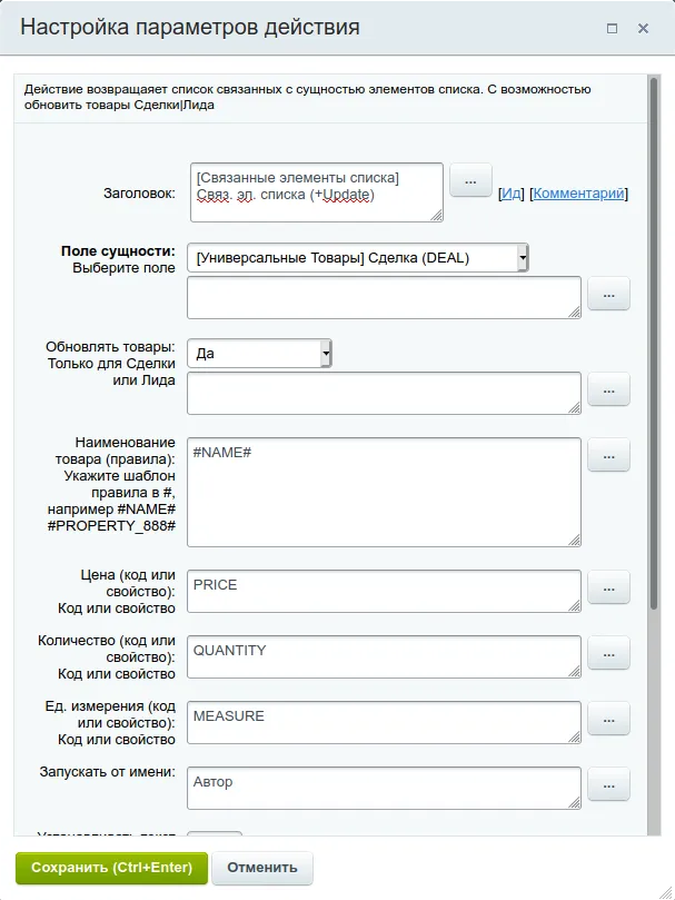 Для сделки или Лида есть опция записать товары из списка в корзину сущности (при наличии соответствующих обязательных полей).